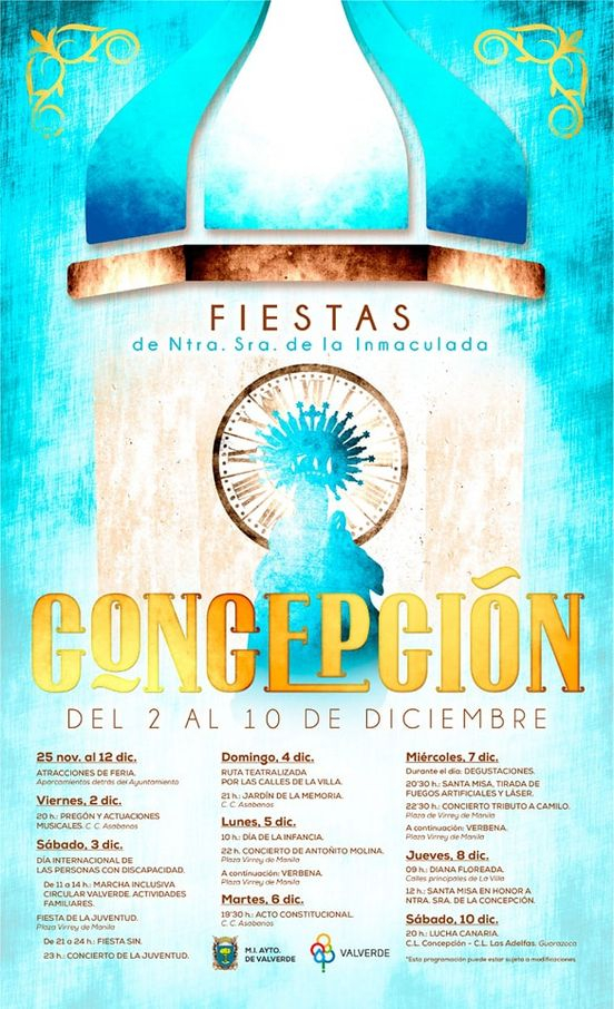 La concejalía de Fiestas del Ayuntamiento de Valverde, invita a todos los vecinos al primer acto de las fiestas de La Concepción, que comenzarán mañana 2 de diciembre en El C.C. Asabanos a las 20:00h. Este año, el pregón que dará el pistoletazo de salida, será pronunciado por Antonio Padrón, tras el cual, los asistentes […]