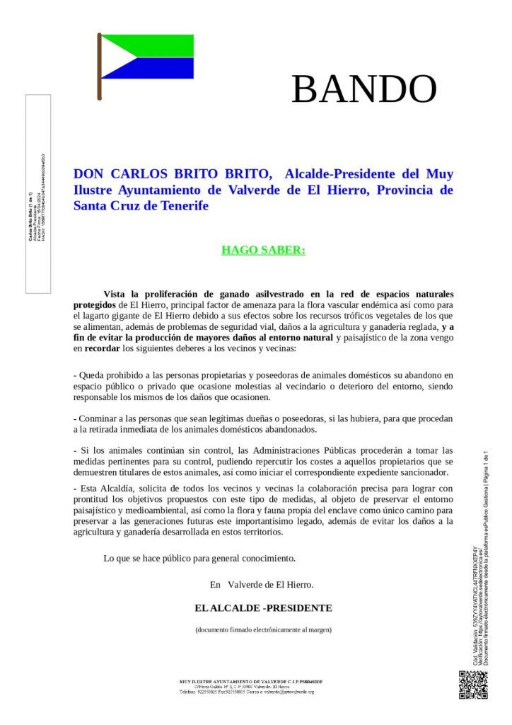 Bando del Ayuntamiento de Valverde sobre la proliferación de ganado asilvestrado