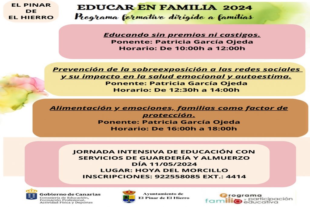 El proyecto pretende acercar a padres, madres o tutores herramientas y estrategias necesarias para la educación de sus hijos e hijas El Ayuntamiento de El Pinar y la Consejería de Educación, Universidades, Cultura y Deportes del Gobierno de Canarias, organizan una nueva edición del programa formativo ‘Educar en familia’, enmarcado dentro del plan ‘Familia y […]