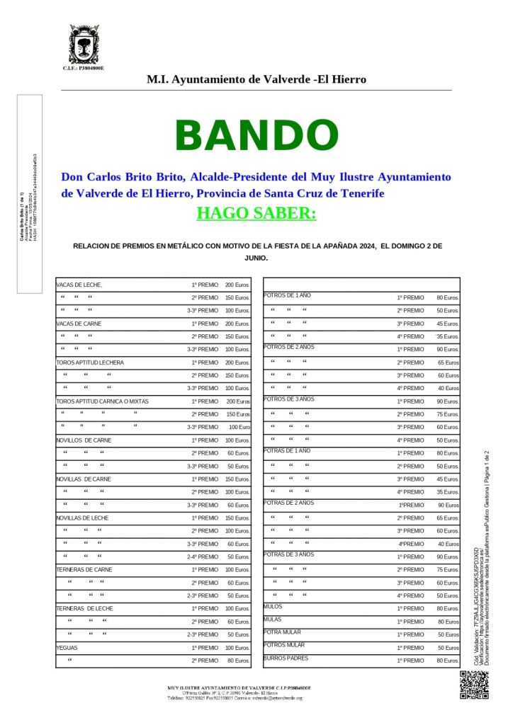 El alcalde del municipio, Carlos Brito, ha dictado el bando en relación a los premios en metálico con motivo de la Fiesta de la Apañada 2024, que tendrá lugar el domingo 2 de junio. Asimismo, y mediante el documento, se pone en conocimiento de los ganaderos interesados en llevar ganado a la feria, que es […]