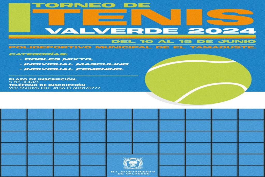 El Ayuntamiento de Valverde, a través de su Concejalía de Deportes, anuncia la celebración de el I Torneo de Tenis, que tendrá lugar del 10 al 15 de junio, en el Polideportivo Municipal de El Tamaduste. Las categorías en la que se disputará el torneo serán: Dobles mixtosIndividual masculinoIndividual femenino El plazo para realizar la […]