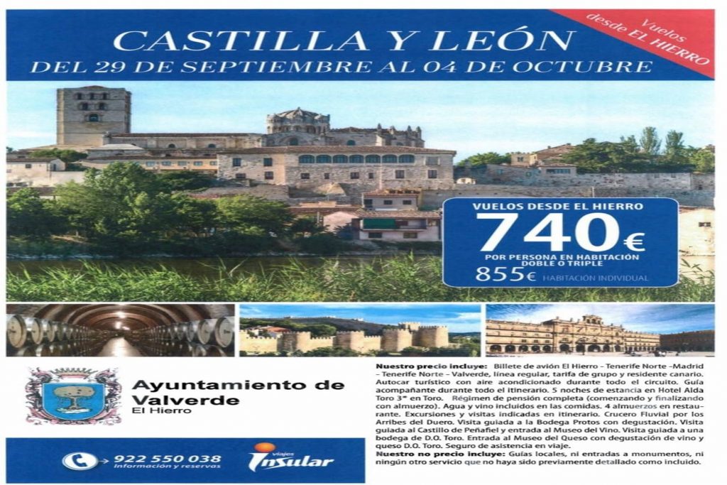 El Ayuntamiento de Valverde, informa que se ha organizado un viaje a Castilla y León, que se realizará del 29 de septiembre al 4 de octubre de 2024. La edad mínima para poder inscribirse es de 18 años. El precio indicado en el cartel, incluye: Billete de avión El Hierro – Tenerife Norte – Madrid […]