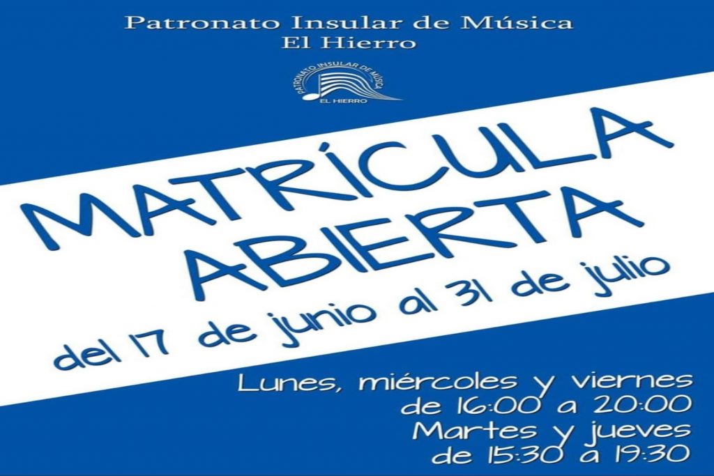 El Ayuntamiento de Valverde informa a la ciudadanía que se ha abierto el periodo de matrícula para el Patronato Insular de Música de El Hierro, la cual se podrá formalizar del 17 de junio al 31 de julio El horario los lunes, miércoles y viernes es de 16:00 a 20:00 horas y los martes y […]