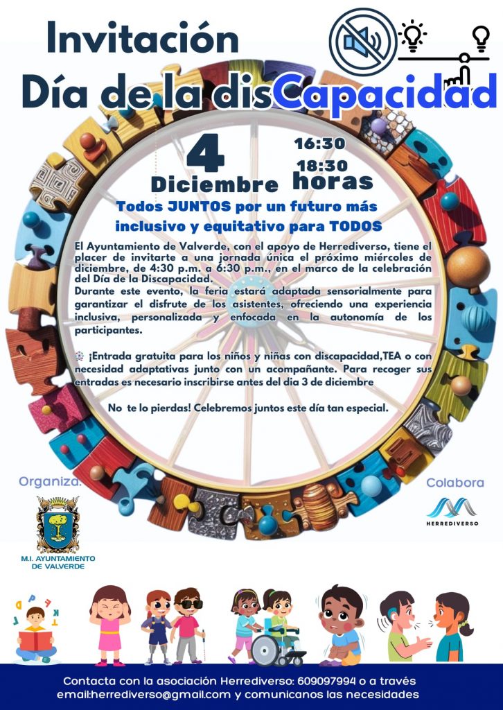 El Ayuntamiento de Valverde, en colaboración con la asociación Herrediverso, invita a la jornada especial del próximo miércoles, 4 dediciembre, de 16:30 a 18:30 horas, en conmemoración del Día Internacional de la Discapacidad. Con el lema “Todos JUNTOS por un futuro más inclusivo y equitativo para TODOS”, el evento ofrecerá una feria adaptada sensorialmente paragarantizar […]