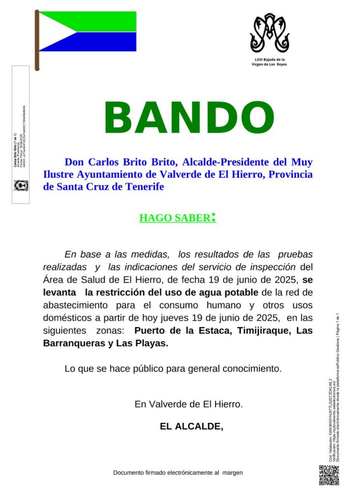BANDO:Ayuntamiento de Valverde- Levantamiento Restricciones Agua