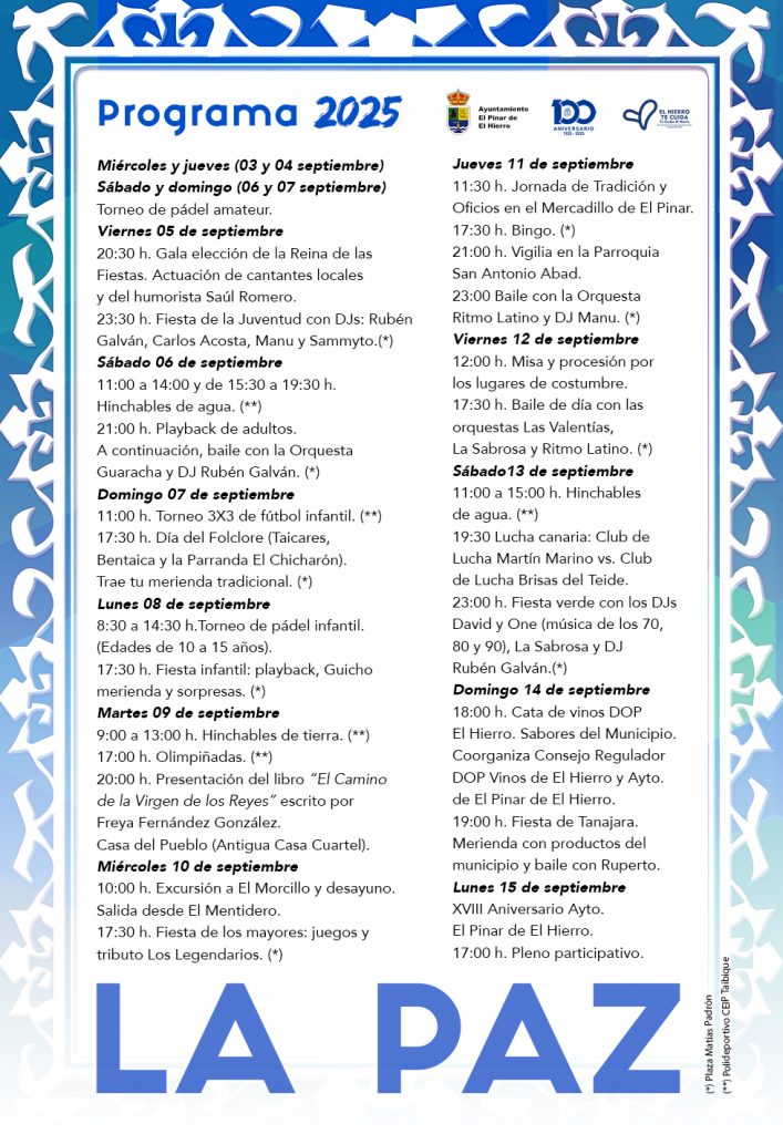 Diferentes actividades traerán diversión, cultura, deporte y espectáculos a los residentes y visitantes de las fiestas del municipio de El Hierro El Ayuntamiento de Pinar de El Hierro celebrará durante diez días consecutivos las fiestas en honor a Nuestra Señora de La Paz, la patrona del municipio. Desde el 5 hasta el 15 de […]