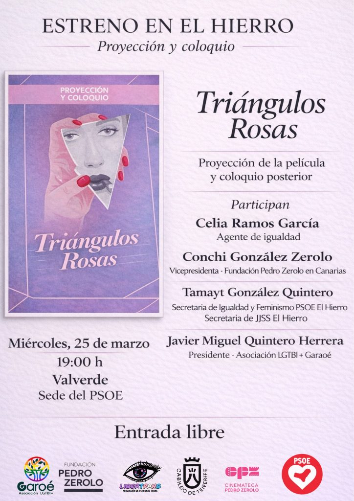 El próximo miércoles 25 de marzo, a las 19:00 h, la sede del PSOE en Valverde acoge la proyección del documental Triángulos Rosas, con entrada gratuita. La película recorre la vida y la lucha de Terri León, Dona Hernández y Marcela Rodríguez durante la represión franquista en Tenerife, visibilizando una realidad históricamente silenciada e incorporando […]