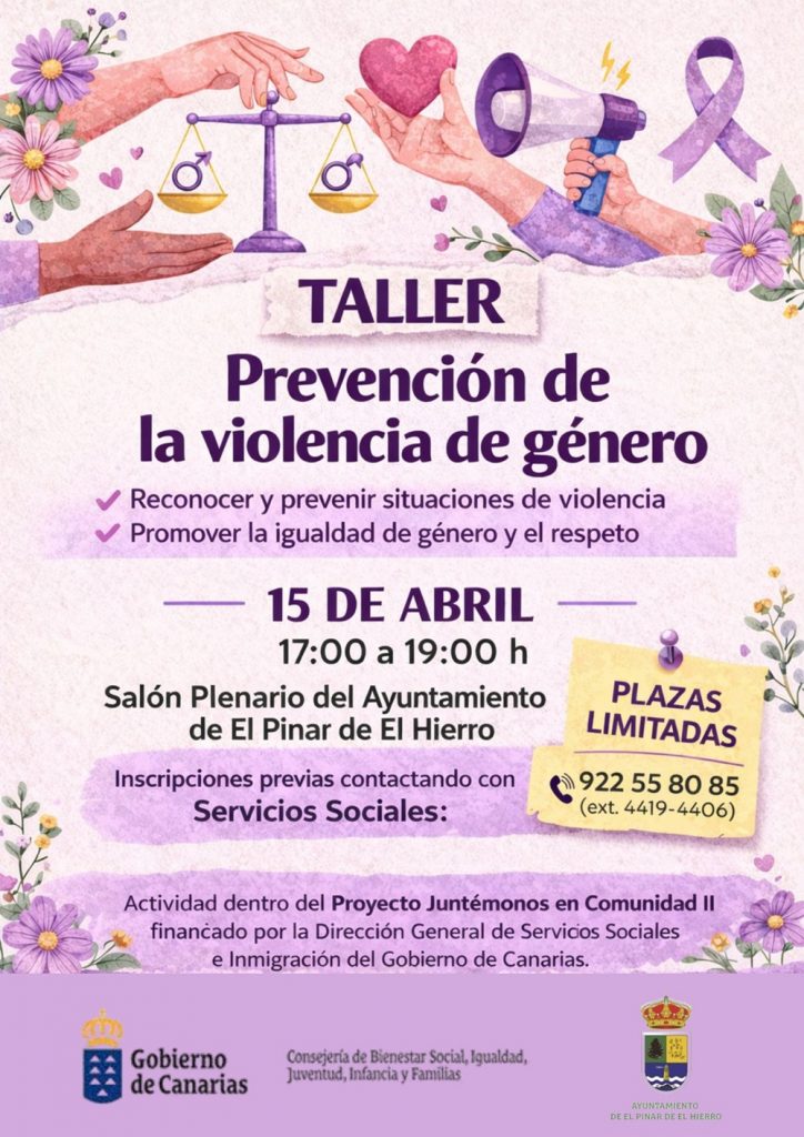La actividad se celebrará en el Salón de Plenos del Ayuntamiento, de 17:00 a 19:00 horas El Pinar de El Hierro acoge este miércoles, 15 de abril, un taller de prevención de la violencia de género, que tiene como principal objetivo reconocer y prevenir las situaciones de violencia, así como promover la igualdad de género […]