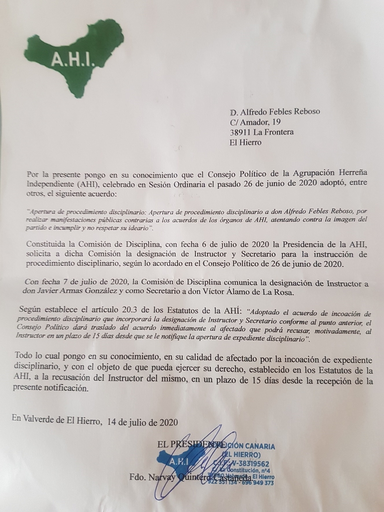 ALFREDO FEBLES-El paso lunes 13 de Julio recibamos una llamada desde la sede de la Agrupación Herreña Independiente que teníamos una “notificación” del presidente “ilegitimo” Narvay Quintero que tenía que recoger “personalmente” dicha comunicación.