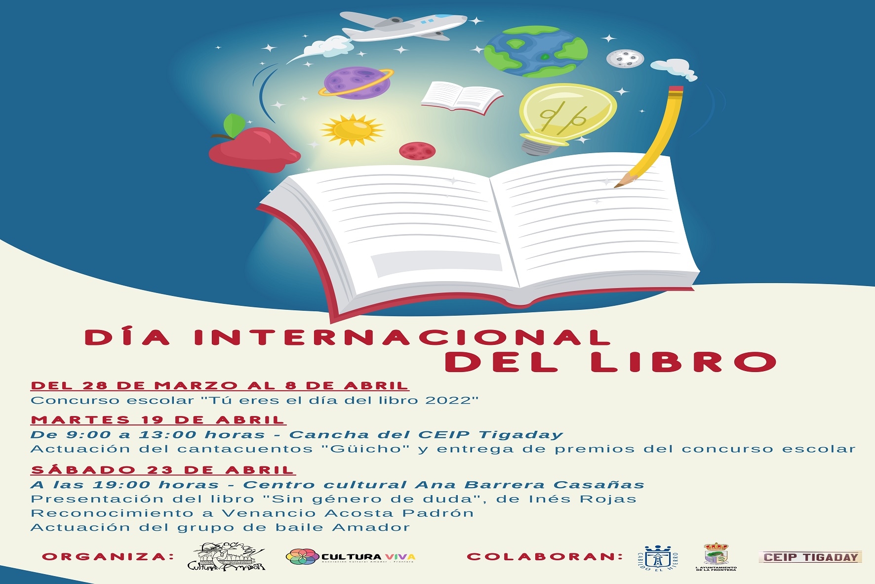 Con el propósito de fomentar el hábito de la lectura, así como potenciar la creatividad y la comprensión lectora de los niñas, niñas y jóvenes del municipio de La Frontera, la Asociación cultural Amador convoca el concurso “Tú eres el día del libro 2022”, este año dedicado a la “Paz en el mundo”, un certamen que cumple su décimo segunda edición.