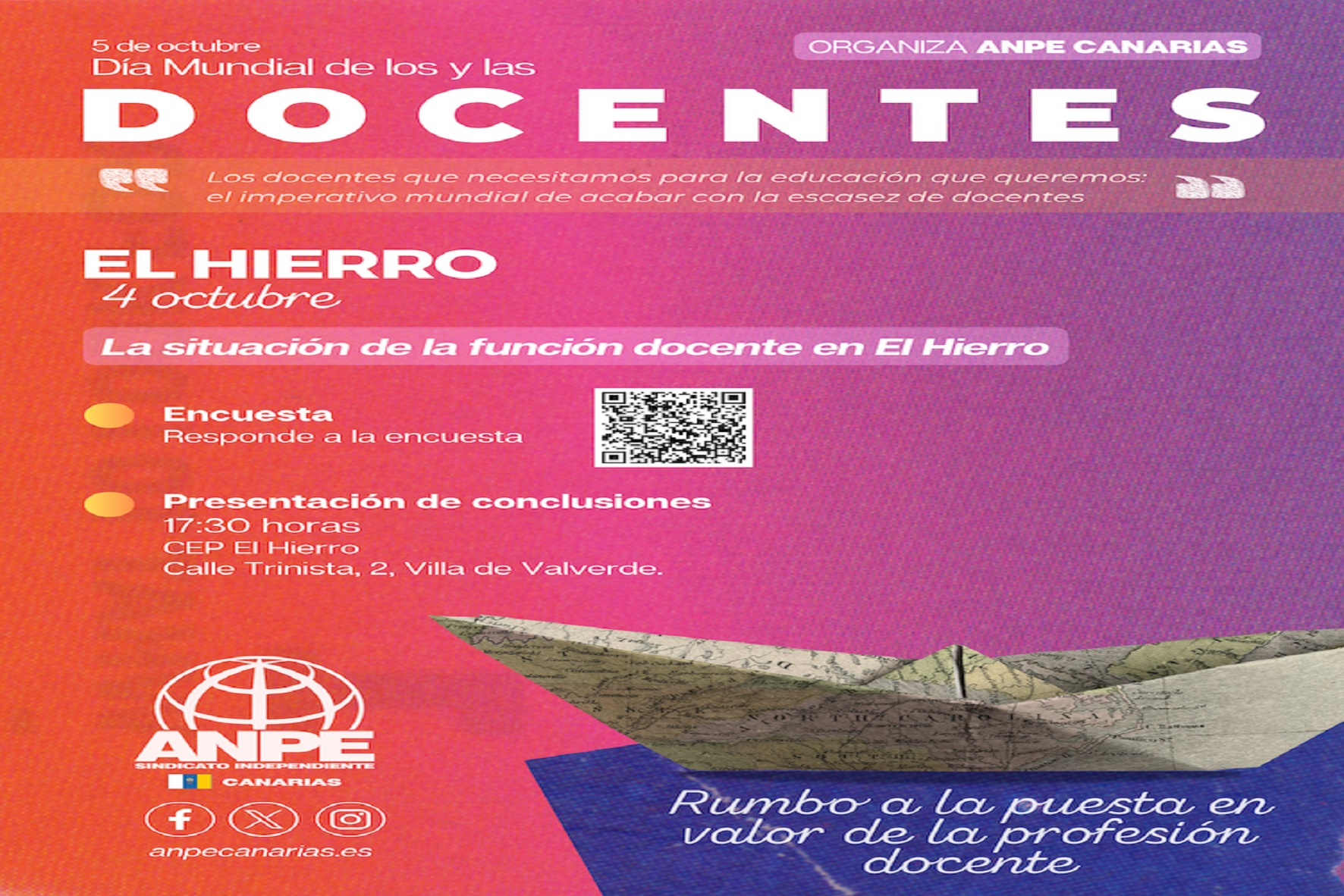 El Centro del Profesorado (CEP) El Hierro, ubicado en la Villa de Valverde, acogerá este miércoles, día 4 de octubre, a partir de las 17:30 horas, uno de los actos organizados por ANPE Canarias en las distintas islas del Archipiélago en torno al Día Mundial de los y las Docentes, que se celebra el 5 de octubre. Se trata de un encuentro entre el profesorado de El Hierro sobre la situación de la función docente en la isla, a partir de una encuesta lanzada por el sindicato entre su afiliación. Las conclusiones se registrarán en la Consejería de Educación para que la Administración educativa tenga en cuenta las demandas del colectivo docente de El Hierro.