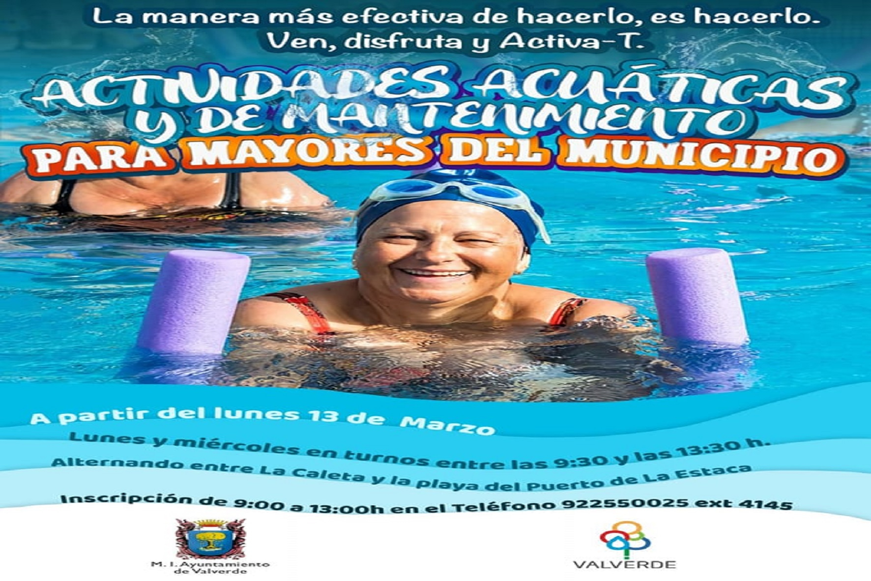 Dentro del programa que está llevando a cabo El Ayuntamiento de Valverde para el desarrollo físico deportivo y cognitivo destinadas a las personas mayores del municipio, las concejalías de Servicios Sociales y del área de Mayores del Ayuntamiento de Valverde ponen en marcha las “ACTIVIDADES ACUÁTICAS PARA PERSONAS MAYORES EN EL MUNICIPIO DE VALVERDE», con el objetivo de promover el envejecimiento activo y la autonomía de las personas usuarias con acciones de prevención y motivación hacia una forma de vida saludable que propicie la mejora de su salud y reducir la regresión de nuestros mayores.