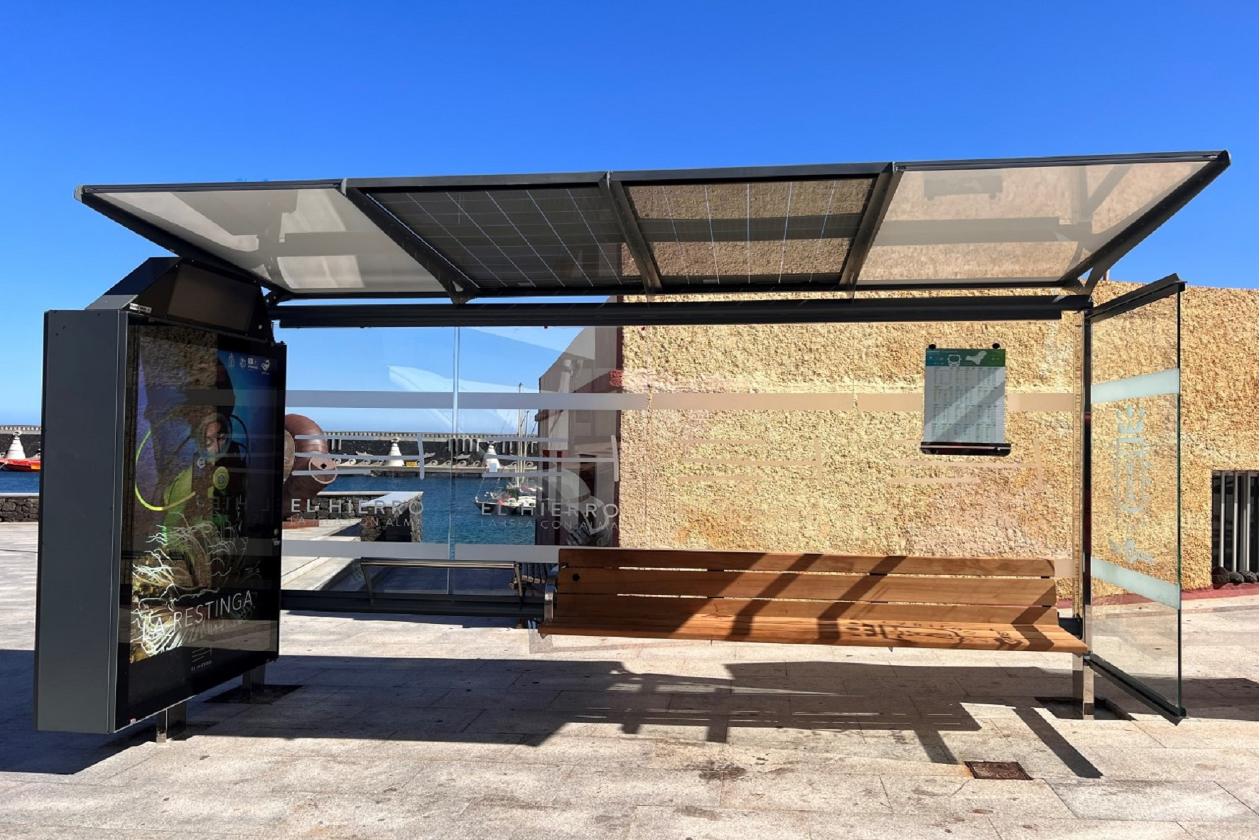 El Cabildo de El Hierro ha instalado en La Restinga la primera marquesina en la isla con placas solares que permiten alimentar una pantalla informativa, en la que ciudadanos y visitantes pueden conocer el tiempo que falta para que las guaguas lleguen a la parada.