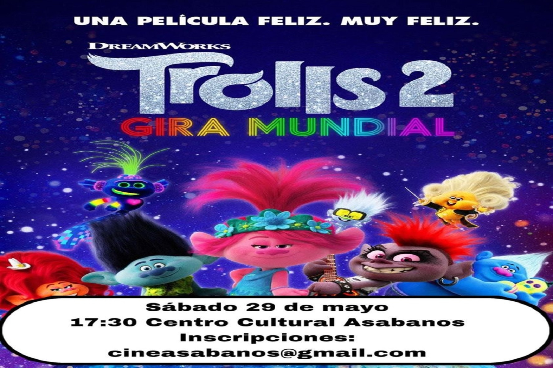 Este sábado 29 de mayo, a las 17:30h, podrán disfrutar de la película Trolls 2 Gira Mundial”, en el Centro Cultural Asabanos.