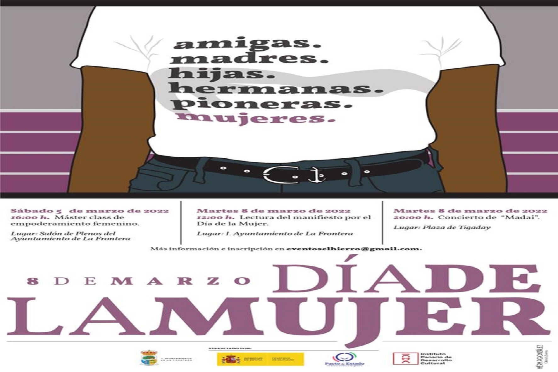 Las otras actividades propuestas tendrán lugar el día conmemorativo, 8 de marzo, a las 12.00 horas con la lectura en el ayuntamiento del Manifiesto por el Día de la Mujer y, ya en la tarde en la plaza Tigaday, a las 20.00 horas se celebrará el concierto del grupo formado por 4 cantantes herreñas Madai, acompañadas por 3 músicos, entre ellos el también herreño Jorge Pérez, que harán un recorrido musical por las canciones de distintas mujeres. Todas las inscripciones se realizarán a través del correo eventoselhierro@gmail.com .