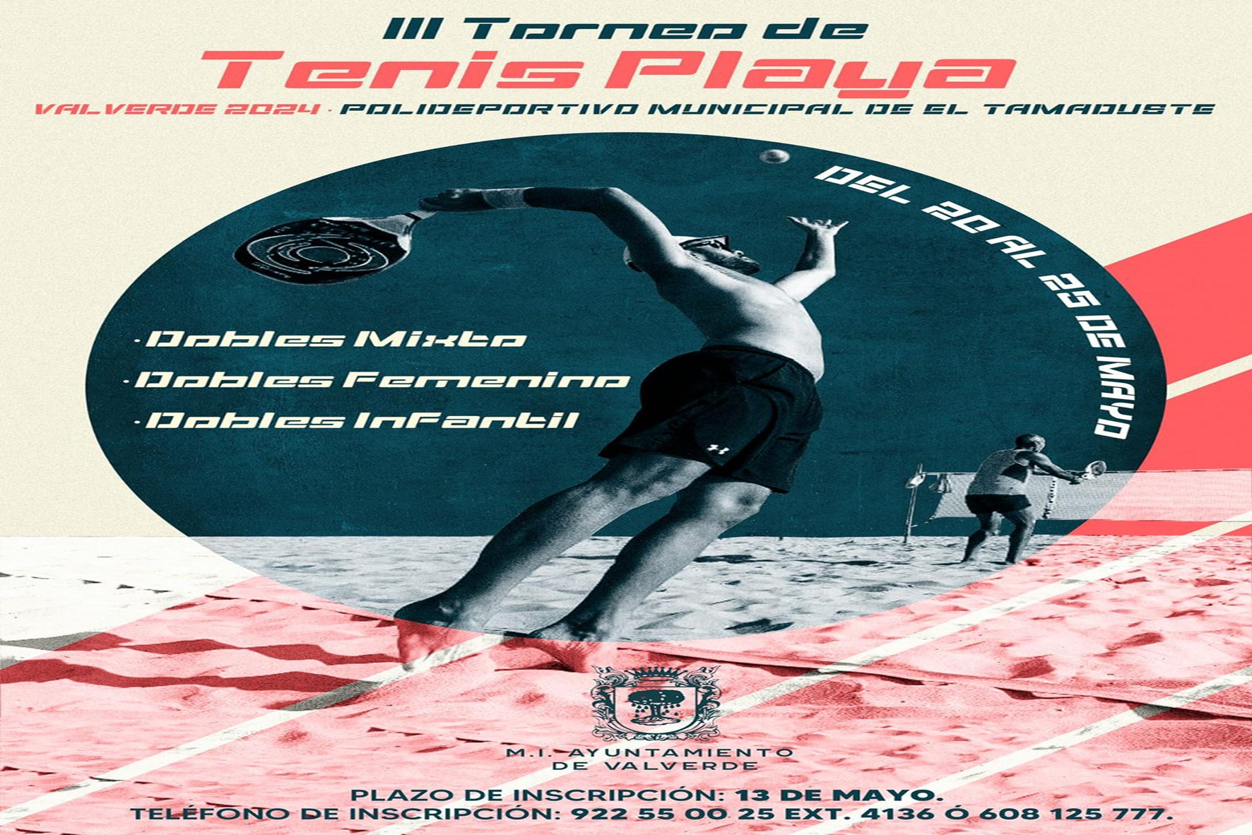 El Ayuntamiento de Valverde, informa del III Torneo de Tenis Playa, que se llevará a cabo en el Polideportivo Municipal de El Tamaduste, ofreciendo varias competiciones en las categorías de Dobles Mixto, Dobles Femenino y Dobles Infantil.
