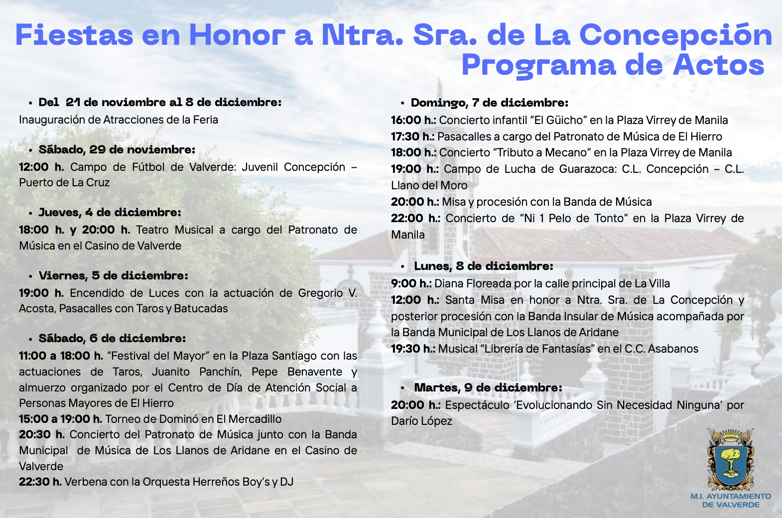 El Ayuntamiento de Valverde da a conocer hoy el programa de actos de las próximas Fiestas en Honor a Nuestra Señora de La Concepción, que se celebran entre el 21 de noviembre y el 9 de diciembre y que reúnen un amplio conjunto de actividades culturales, deportivas, musicales y tradicionales para todas las edades.