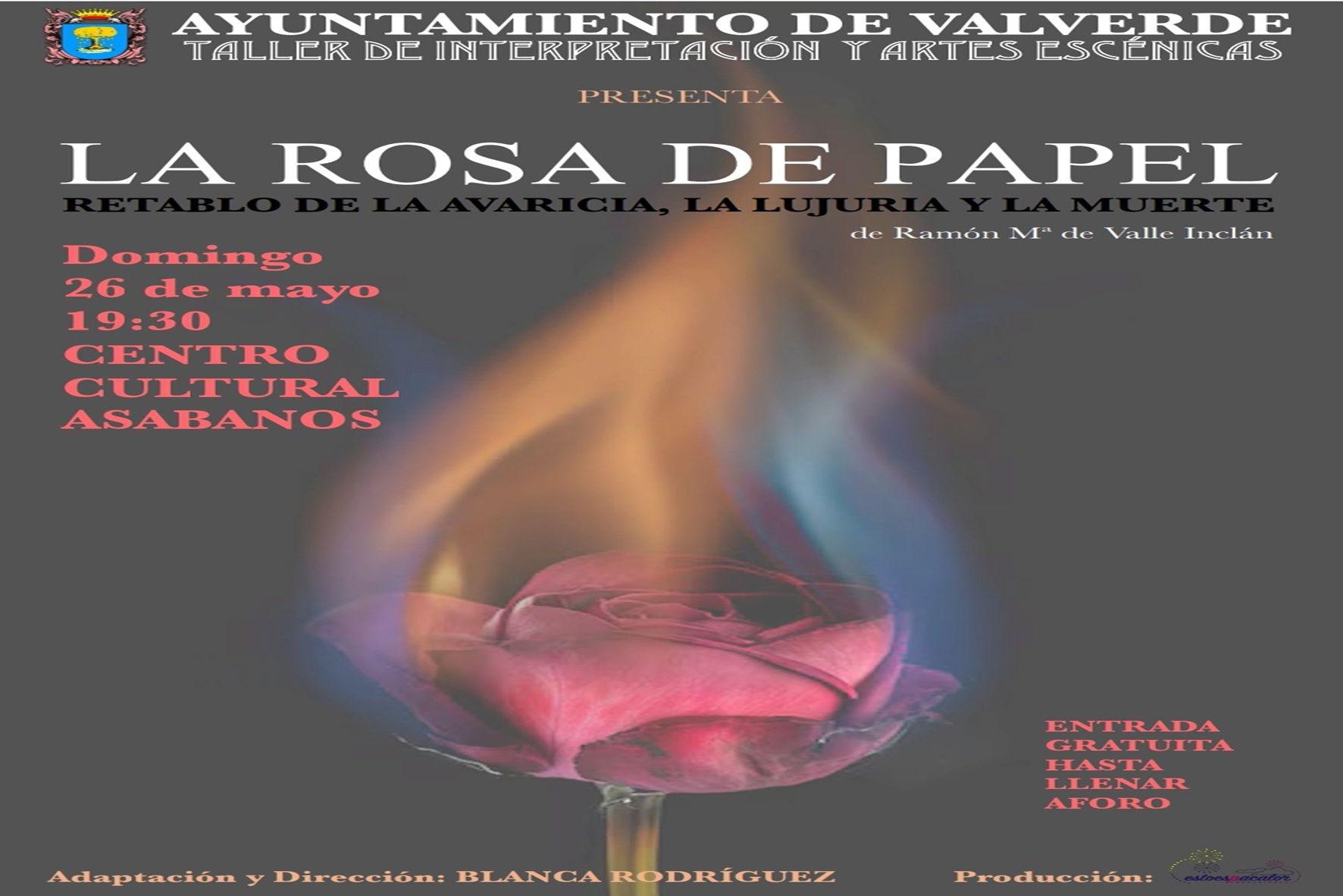 Una vez culminado este taller de interpretación y artes escénicas, el próximo domingo, 26 de mayo, a las 19:30h, en el Centro Cultural Asabanos se pondrá en escena la obra “LA ROSA DE PAPEL”, perteneciente al “Retablo de la Avaricia, la Lujuria y la Muerte”, de Ramon Mª de Valle Inclán, escritor, poeta y dramaturgo español, uno de los principales exponentes de lo que vino a llamarse “El Esperpento”, un dramatismo extremo para denunciar lo establecido y reflejar la hipocresía de la sociedad. Un obra adaptada y dirigida, por la propia Blanca Rodríguez, que ha servido como hilo conductor del taller y que ha supuesto un intenso ejercicio de aprendizaje para los actores y actrices, que ahora quieren compartir el trabajo realizado con todo el público.