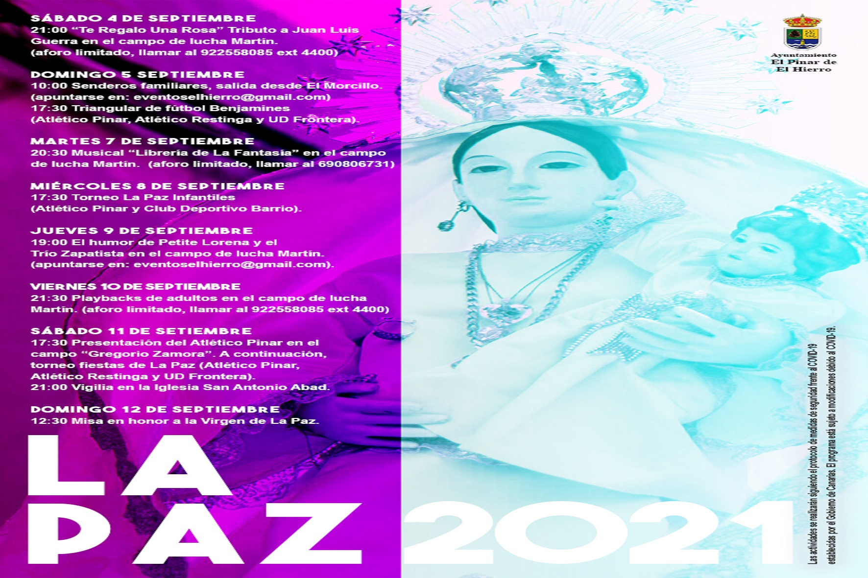 El Ayuntamiento de El Pinar ha presentado el programa de actos de las Fiestas de Nuestra Señora de La Paz 2021 que arrancarán el próximo sábado 4 de septiembre, a las 21:00 horas, con un tributo al cantante Juan Luis Guerra, bajo el nombre ‘Te regalo una rosa’, en el campo de lucha Martín. Para asistir, es necesario llamar al teléfono 922-55-80-85 extensión 4400 dado que el aforo estará limitado.