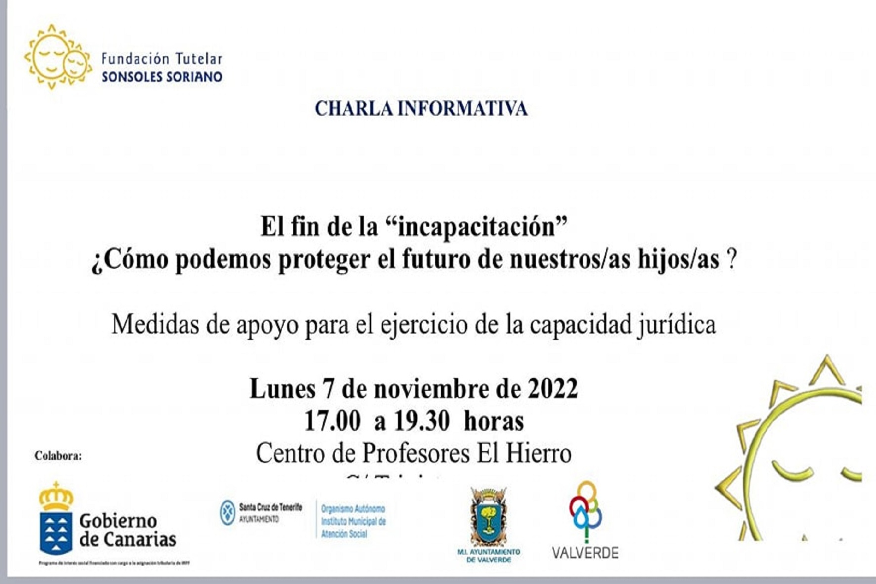 Este lunes 7 de noviembre en El Centro de Profesores de El Hierro, de 17h a 19:30h tendrá lugar una charla informativa sobre La Reforma del Código Civil destinado a familias impartida por La Fundación Tutelar Sonsoles Soriano.