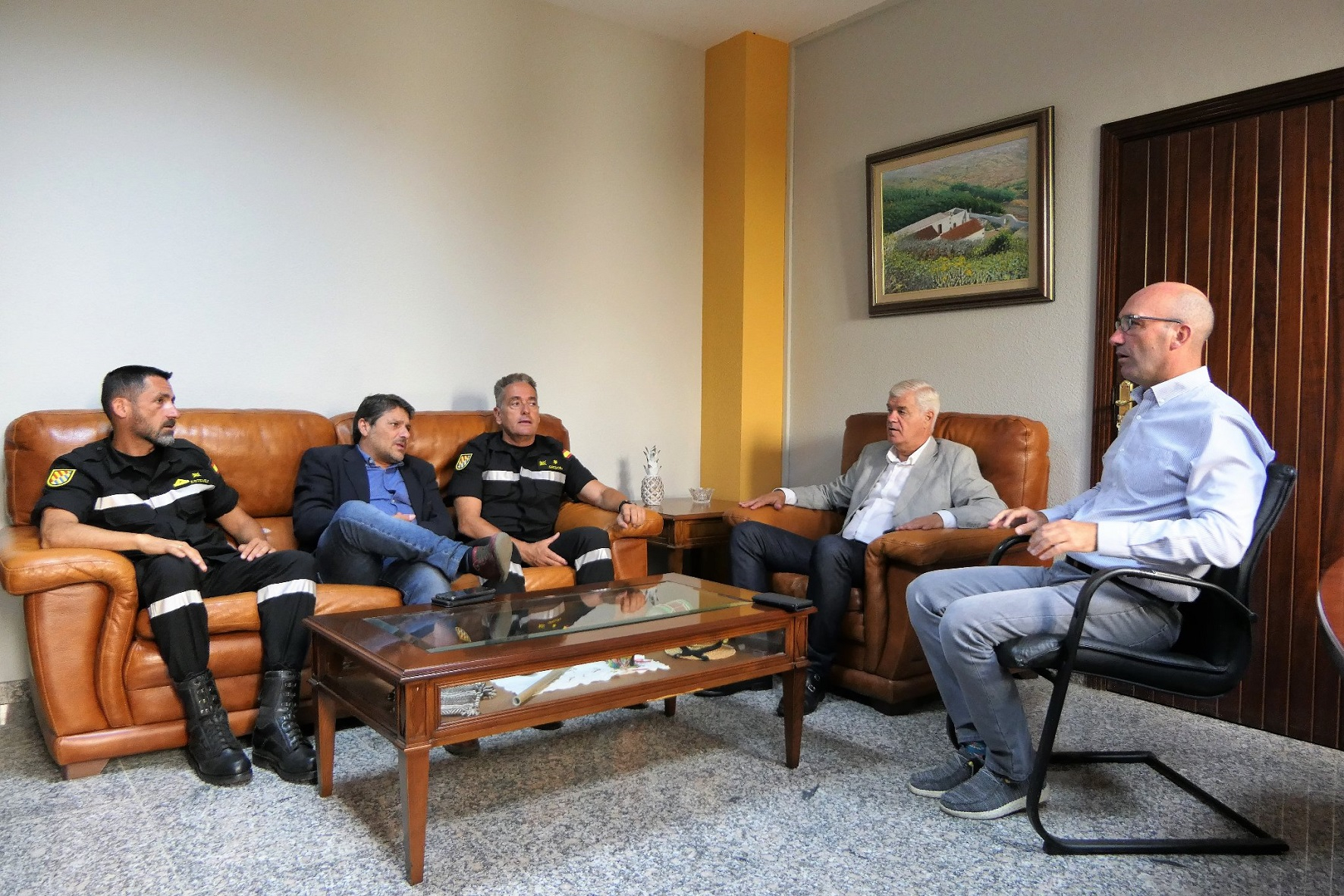 El Comandante Jefe de la UME en Canarias, Enrique Gregory Trovo, acompañado por el Director Insular de la Administración General del Estado, José Carlos Hernández, y el Cabo Mayor, Reinaldo Estévez Sánchez, realizó su primera visita oficial al Cabildo de El Hierro que sirvió además para conocer la campaña contra incendios para este año, en el marco del Plan de Actuación de Plan de Actuación Insular de Proteccion Civil y Atención de Emergencias por Incendios Forestales en la isla de El Hierro (INFOHI).