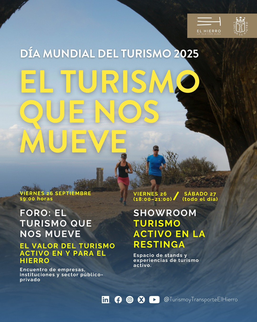Valverde, 23 de septiembre de 2025. El Cabildo de El Hierro, a través de su Consejería de Turismo, Transporte y Comunicaciones, ha diseñado un programa especial para celebrar el Día Mundial del Turismo 2025, que se desarrollará el 26 y 27 de septiembre bajo el lema “El Turismo que nos Mueve: el valor del Turismo Activo en y para El Hierro”.