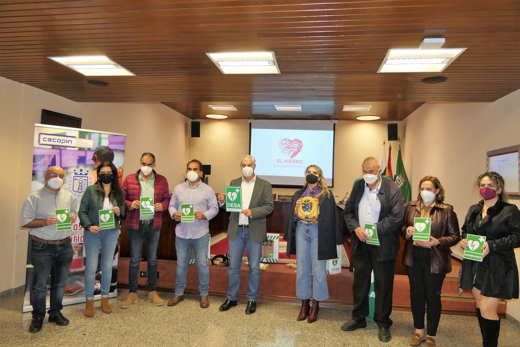 La isla de El Hierro contará desde hoy martes, 8 de febrero, con una red de 16 desfibriladores semiautomáticos urbanos instalados por el Cabildo de El Hierro en instituciones públicas, centros de interés turístico y residencias para mayores a lo largo de toda la geografía insular, los cuales se unen a los ya existentes. Un proyecto con el que la institución insular aspira a convertir a El Hierro en una “Isla Cardioprotegida”, todo ello dentro de su compromiso en materia de salud y bienestar tanto para la población residente como para los visitantes, tal y como pusieron de relieve el presidente insular, Alpidio Armas, y la consejera de Medio Ambiente, Seguridad y Emergencias, Montserrat Gutiérrez, durante la presentación y entrega de estas estaciones a representantes de los ayuntamientos y consejeras de las áreas de Turismo, Servicios Sociales y Personal, responsables de los centros en los que se ubicarán y a los que se ofrecerá formación específica a sus empleados.