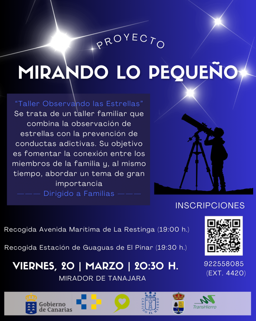 El punto de recogida será la parada de guaguas de la Avenida Marítima de La Restinga, a las 19.00 horas, y la Estación de Guaguas de El Pinar, a las 19.30 horas. La actividad cuenta con plazas limitadas y requiere inscripción previa antes del miércoles 18 de marzo, a través del teléfono 922 558 085 (ext.4419), o el código QR del cartel informativo.