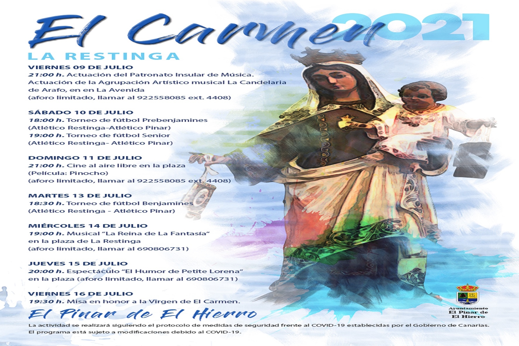 Las fiestas comenzarán el viernes 9 de julio con la actuación del Patronato Insular de Música de El Hierro y de la Agrupación artístico musical La Candelaria, de Arafo, en la Avenida de La Restinga, a las 21:00 horas.