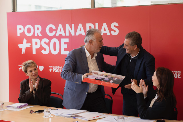 Torres, además, obsequió a los compañeros herreños de la Ejecutiva con una emotiva fotografía de la pasada legislatura, cuando el PSOE gobernaba en todas las instituciones de aquella isla, en la que aparecen el propio Torres y Chinea saludándose en presencia de Juan Miguel Padrón (alcalde El Pinar) y Pedro Miguel Ángel Acosta (entonces alcalde de Frontera) y Alpidio Armas (presidente del Cabildo insular). El detalle fue recogido por Rafael Zamora, secretario de Acción Exterior de la dirección regional socialista.