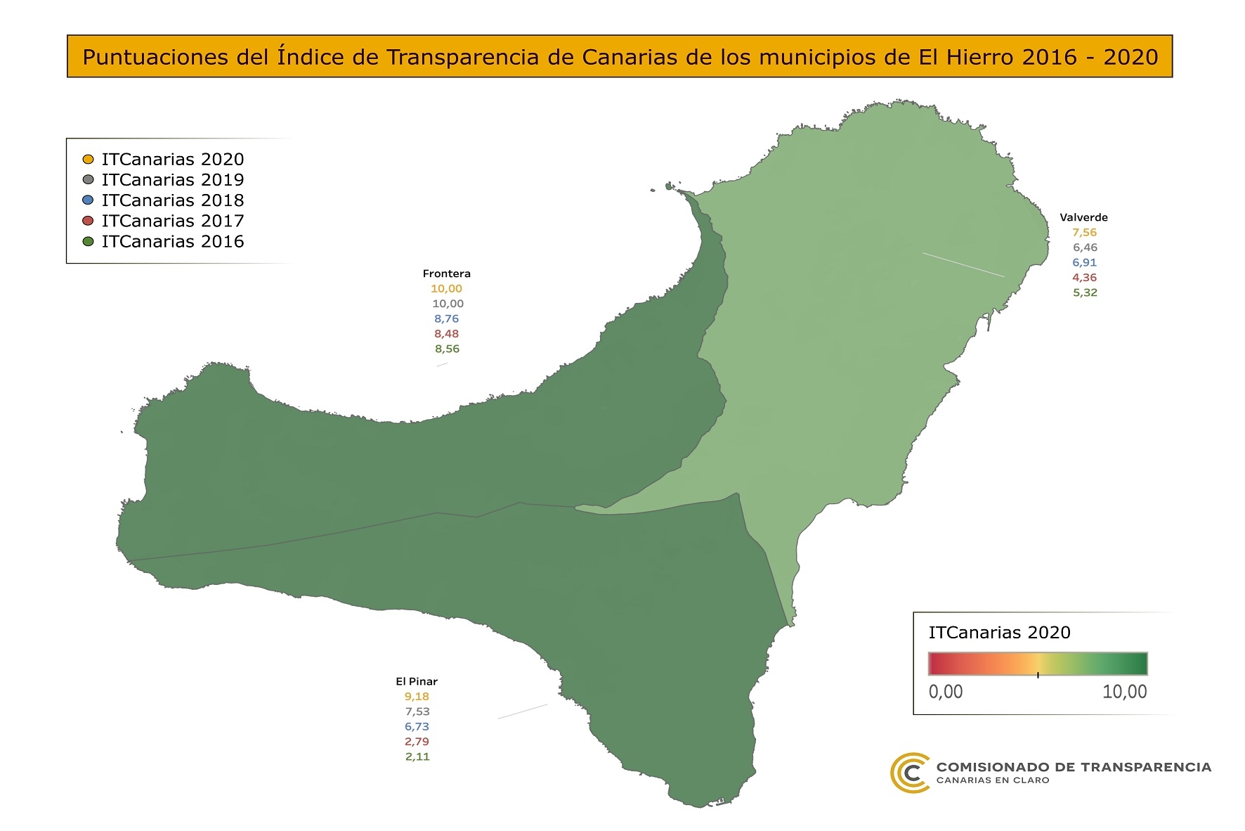 El portal de transparencia del Ayuntamiento de La Frontera repite en la primera posición por quinto año consecutivo, manteniendo el 10 que ya obtuvo en 2019. El Ayuntamiento de El Pinar supera el sobresaliente, pasando del 7,53 que alcanzó en 2019 a un 9,18 en la última evaluación. Finalmente, el Ayuntamiento de Valverde mejora con respecto al ejercicio anterior, alcanzando el notable por primera vez con un 7,56.