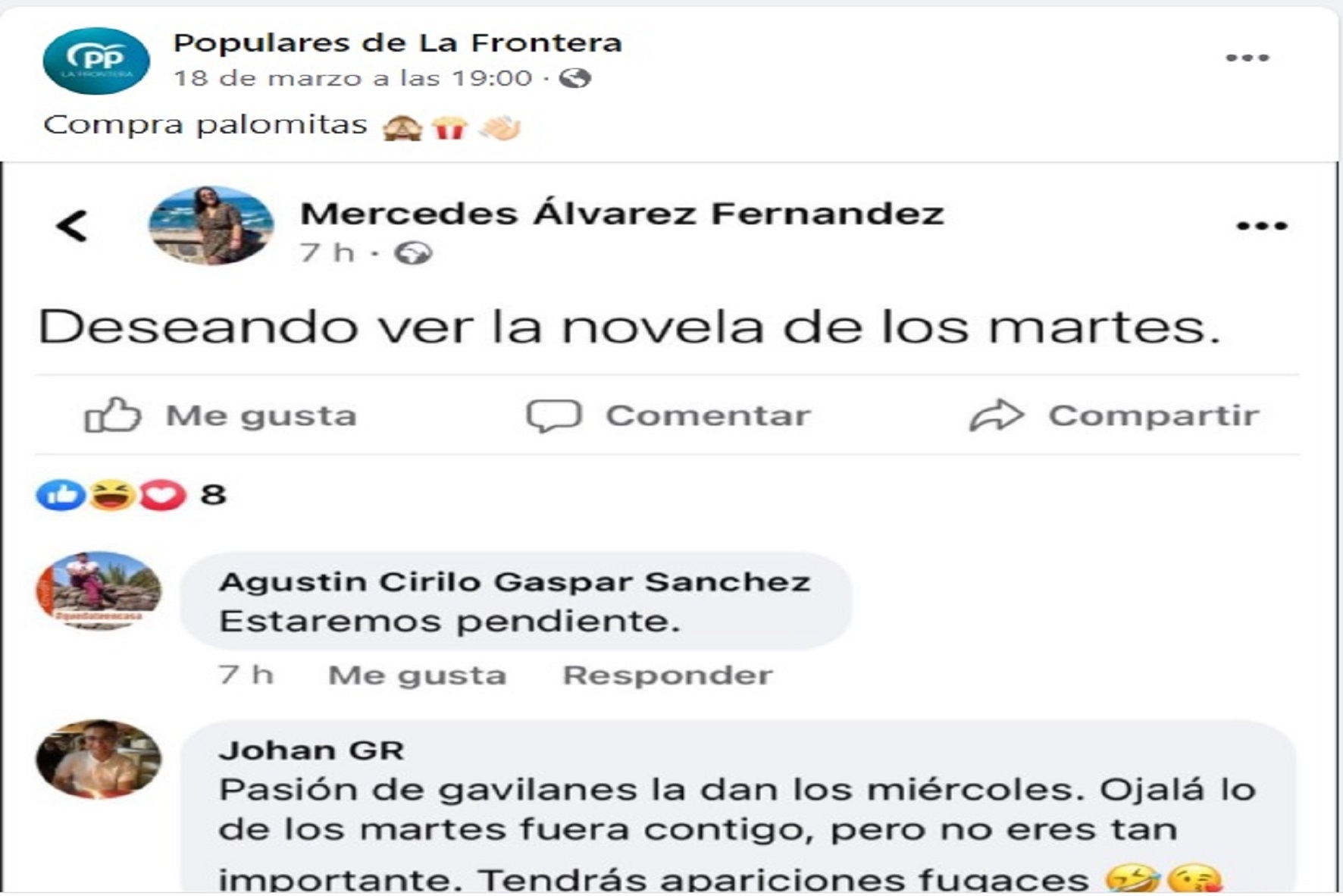 La polémica estaba servida, la concejal del PSOE en el Ayuntamiento de La Frontera Mercedes Álvarez lanza en sus redes sociales que “deseando ver la novela de los martes” en referencia a los videos de Johan González. El Partido Popular de la Frontera lanza un pantallazo de la publicación y contesta “Compra palomitas”.