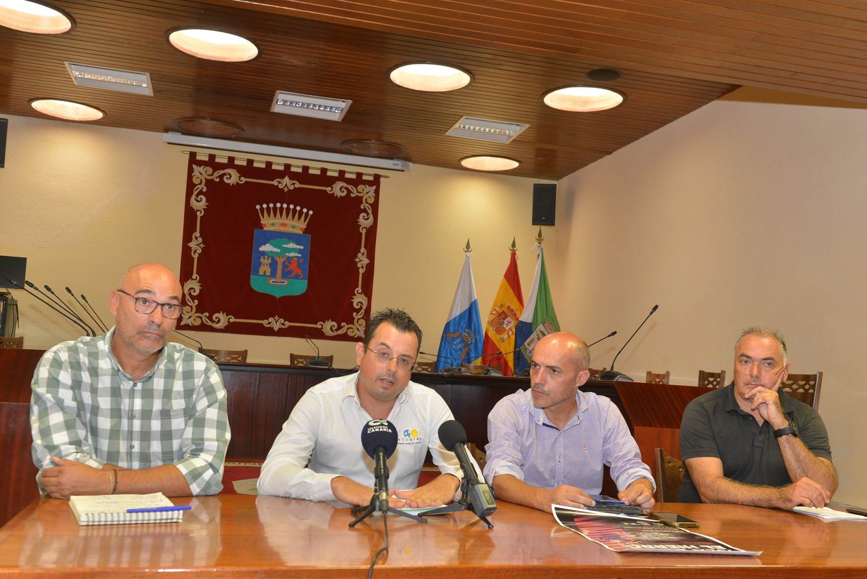 El vicepresidente del Cabildo de El Hierro, David Cabrera, y el consejero insular de Deportes, Emilio Hernández, acompañados por el presidente de la Federación Canaria de Triatlón, Adrián Ornia, y el director de organización, Isidro Casanova, presentaron hoy jueves, 24 de agosto, el I Triatlón Isla de El Hierro, que se disputará los 16 y 17 de septiembre próximos en el Puerto de La Estaca, en el municipio de Valverde, cuyo Ayuntamiento colabora en esta prueba.