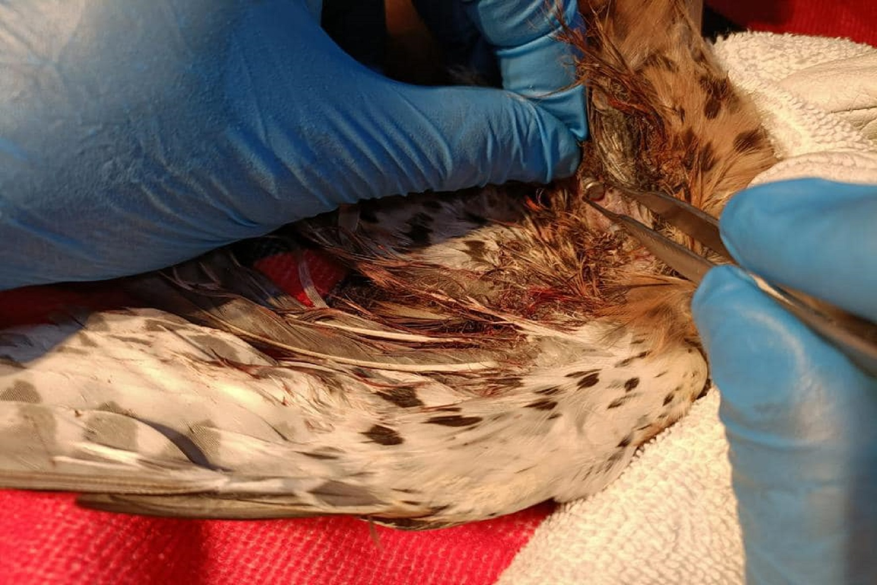El animal se ha trasladado e ingresado en el centro de recuperación de fauna silvestre de La Tahonilla, tras ser sometido a una exploración clínica y una radiografía, se observa una herida en el costado izquierdo como consecuencia de un balín provocado por un arma de fuego, con fractura también del cúbito del ala izquierda.