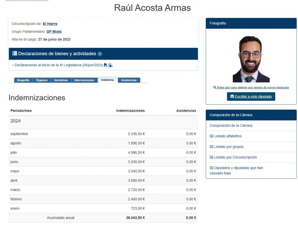 Raúl Acosta(AHI) se hace de oro como diputado, cobra 9.583,00 euros en dietas en solo 4 meses,21.909,00 en 10 meses