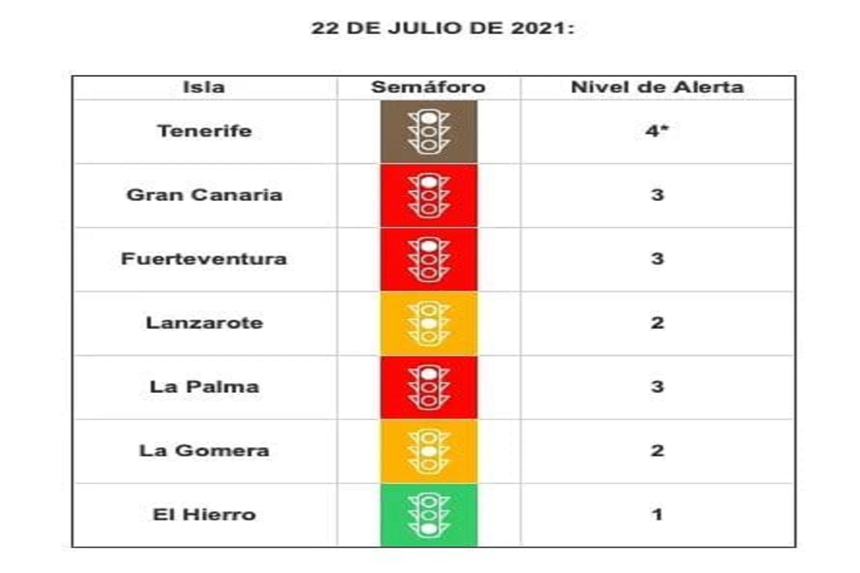 El Gobierno acordó, por tanto, que la isla de Tenerife, que registra la peor evolución de la pandemia, suba a nivel de alerta 4; las islas de Gran Canaria, Fuerteventura y La Palma pasen a nivel de alerta 3 y Lanzarote y La Gomera, a nivel 2. Los cambios de nivel entran en vigor desde hoy, con la publicación del semáforo por parte de la Dirección General de Salud Pública, excepto el paso a nivel 4 por los cambios normativos que se aprobaron hoy y que han de salir publicados el próximo lunes en el BOC.