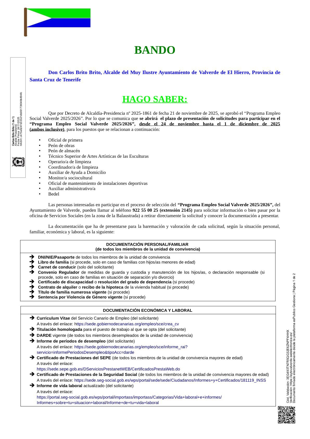 El Ayuntamiento de Valverde ha aprobado el Programa de Empleo Social Valverde 2025/2026 y ha abierto el plazo de solicitudes desde el 24 de noviembre hasta el 1 de diciembre, ambos inclusive. El proyecto ofrece oportunidades laborales en distintas áreas municipales, con plazas como: