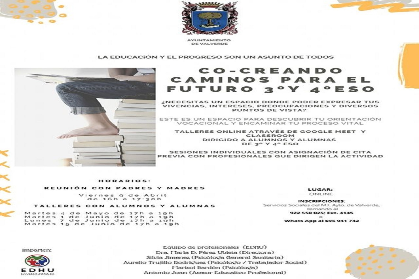 El Ayuntamiento de Valverde, a través de La Concejalías de Servicios Sociales, Educación y Juventud celebra a partir de abril “Co-creando Caminos para el Futuro”, un proyecto innovador creado para el alumnado de 3º, 4º de la ESO, 1º, 2º de Bachillerato y Ciclos Formativos.
