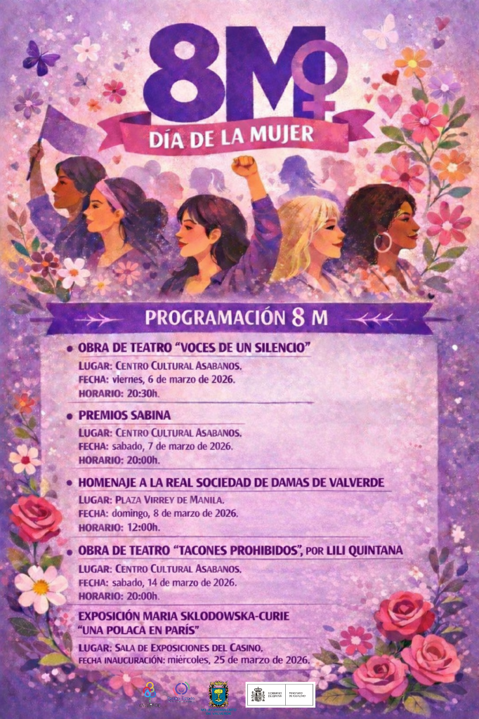 Los actos comenzarán el 6 de marzo con la obra “Voces de un silencio” en el Centro Cultural Asabanos. El 7 de marzo se celebrarán los Premios Sabina y el 8 de marzo tendrá lugar el homenaje a la Real Sociedad de Damas de Valverde en la Plaza Virrey de Manila. La programación se completará el 25 de marzo con la inauguración de la exposición “Maria Sklodowska-Curie: Una polaca en París” en la Sala de Exposiciones del Casino.