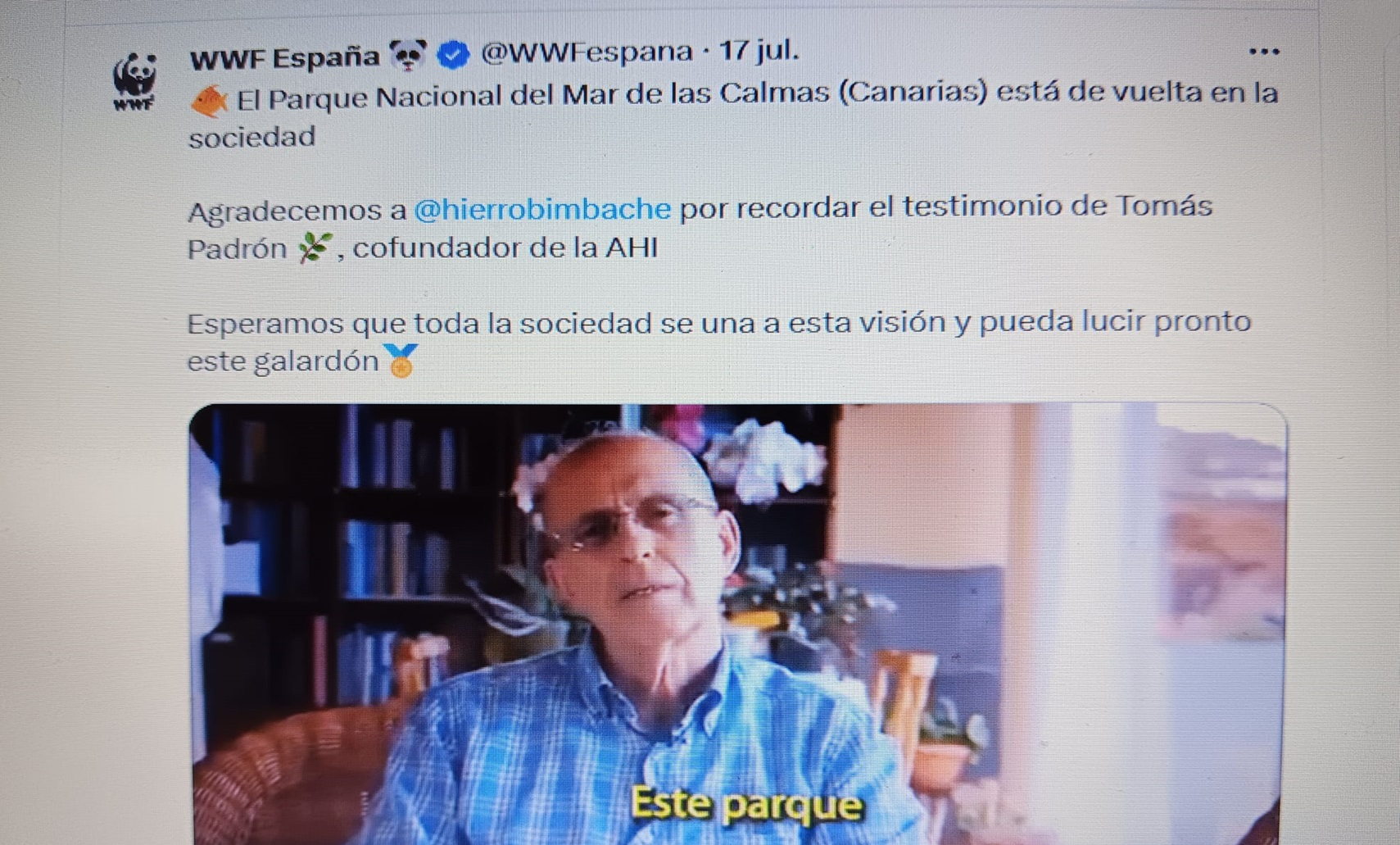 WWF ESPAÑA agradece a El Hierro Bimbache.es, en sus redes sociales (en X antes Twitter, pincha enlace https://x.com/WWFespana/status/1813530704564633762 ) por recordar el testimonio de Tomas Padrón, cofundador de la AHI, donde esperan, que toda la sociedad herreña se una a esta visión y pueda lucir pronto este galardón, en referencia al Parque Nacional Marino.(PINCHA AQUÍ PARA VER LA NOTICIA).